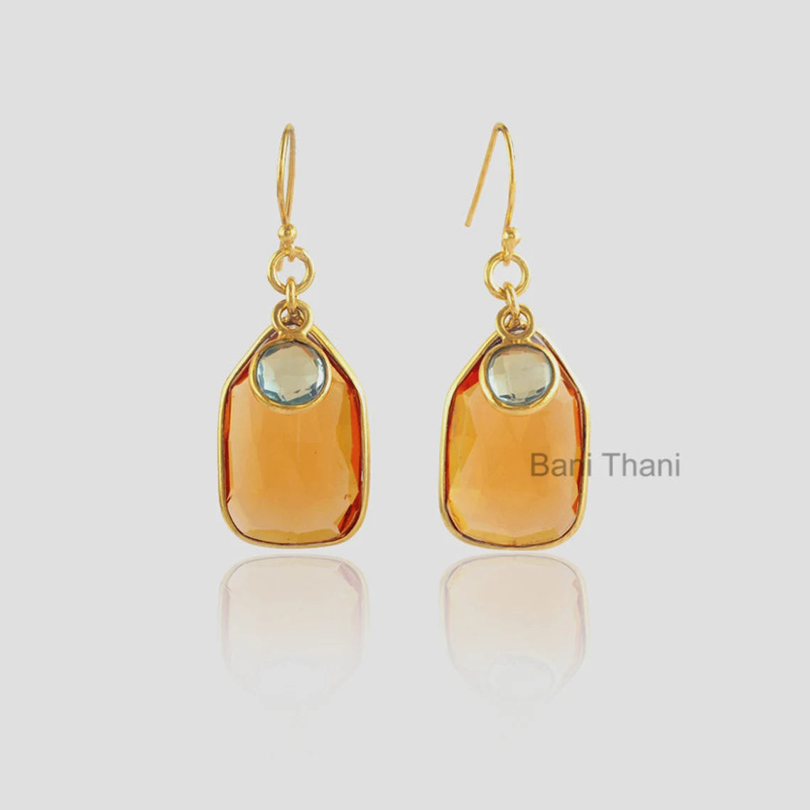 Champagne Quartz Fancy and Aqua Quartz Faceted Micron Gold Plated 925 Sterling Silver Dangle Earring Jewelry