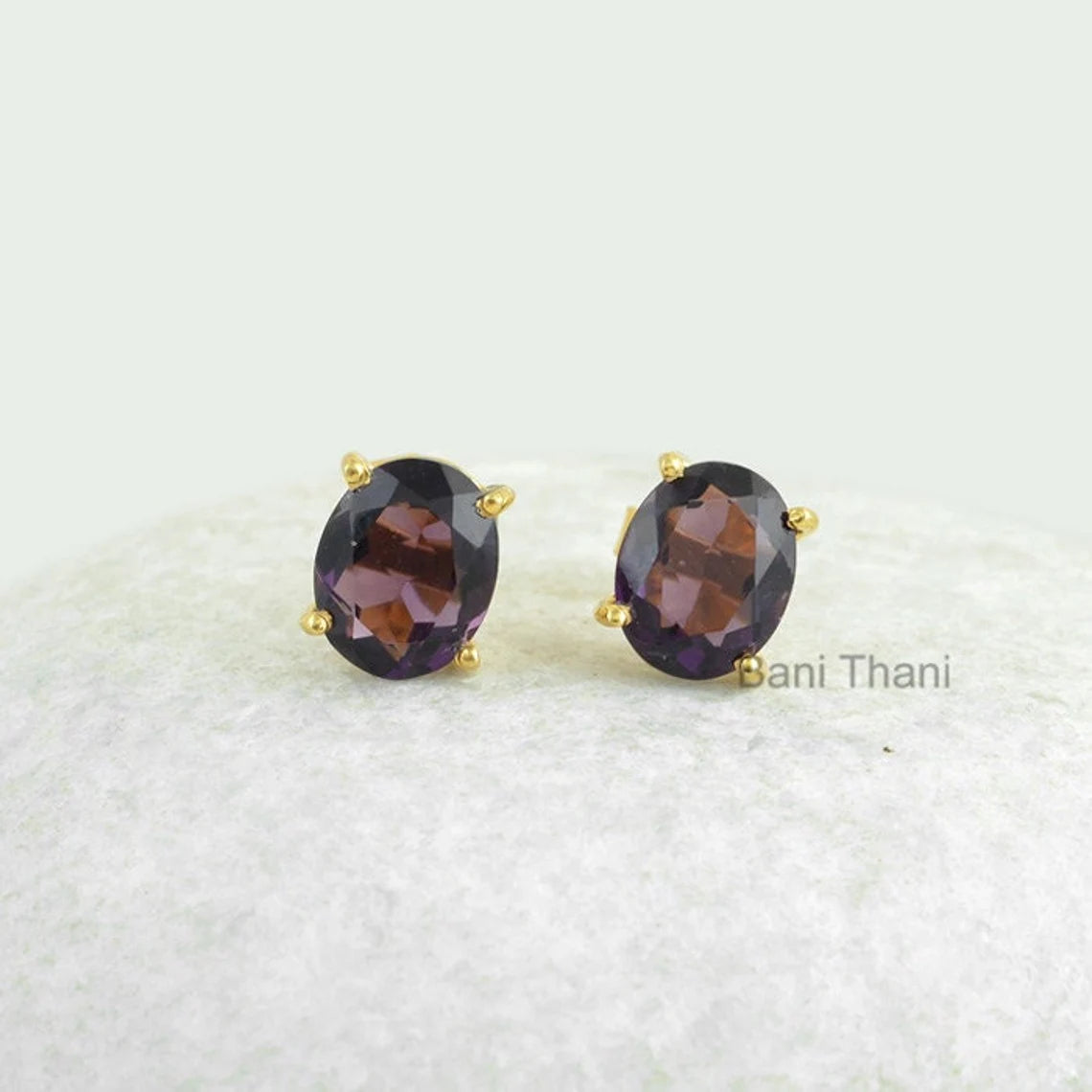 Prong Stud Earring-Purple Amethyst Quartz 8x10mm Oval Stud Gemstone Earrings-Gold Plated 925 Sterling Silver Jewelry-Christmas Gift Earrings