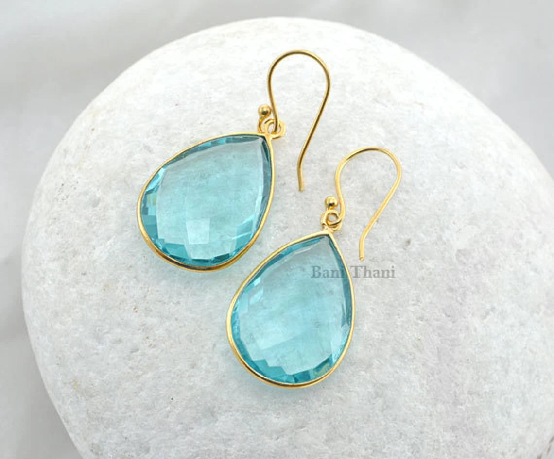 Aqua Quartz Faceted Pear Gemstone Earrings Gold Plated 925 Sterling Silver Earrings, 16x22mm