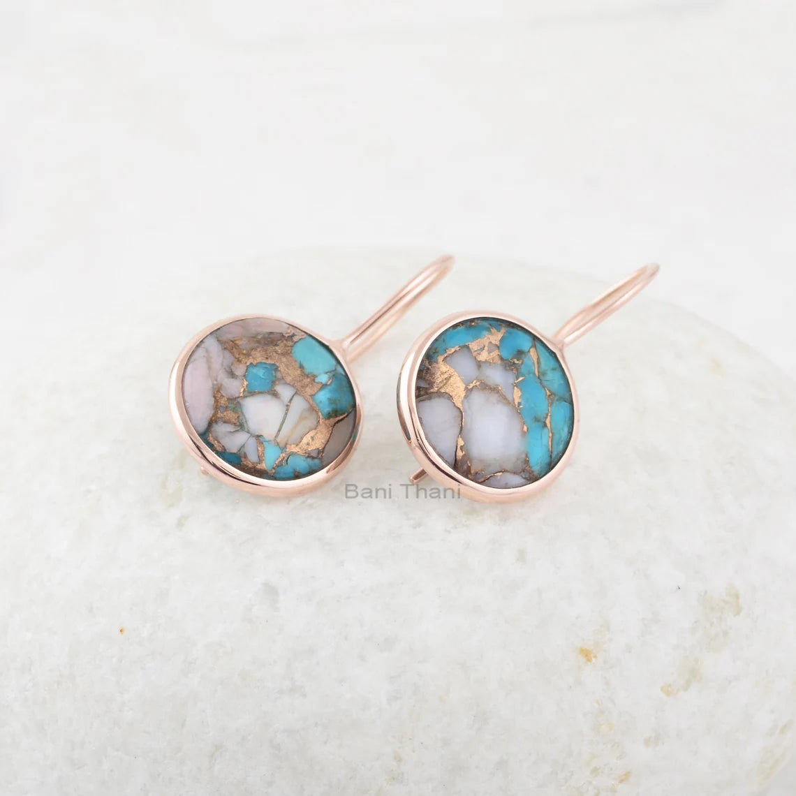Pink Opal Turquoise Earrings, Pink Opal Copper Turquoise 15 mm Round Gemstone Silver Earrings, Rose Gold Plated Drop Earring Women Gift