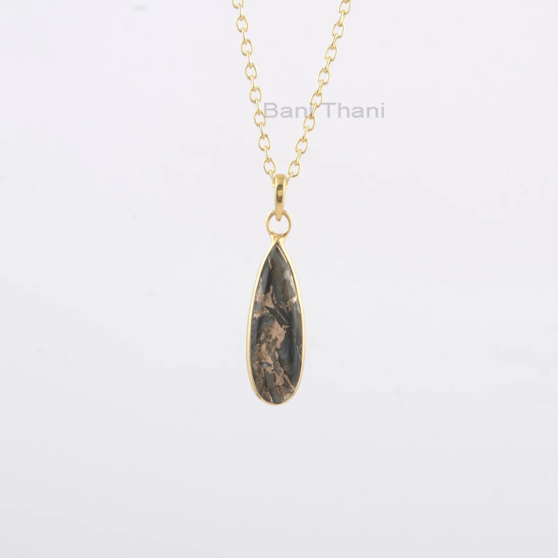 Long Pear Black Shell Necklace, Copper Shell 8x25mm Gemstone Necklace, 18k Gold Plated Necklace, Silver Bezel Gift Necklace, Womens Necklace