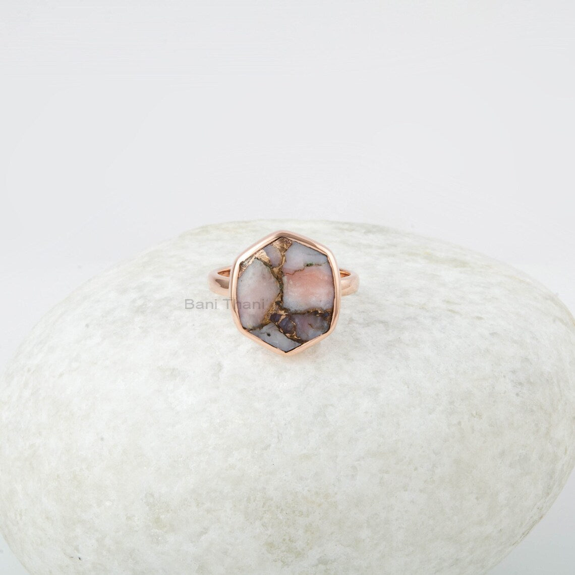 Hexagon Silver Ring - Gemstone Ring - Pink Opal Copper 13x15mm Ring - Rose Gold Plated Ring - Ring for Women - Handmade Ring - Gift for Her