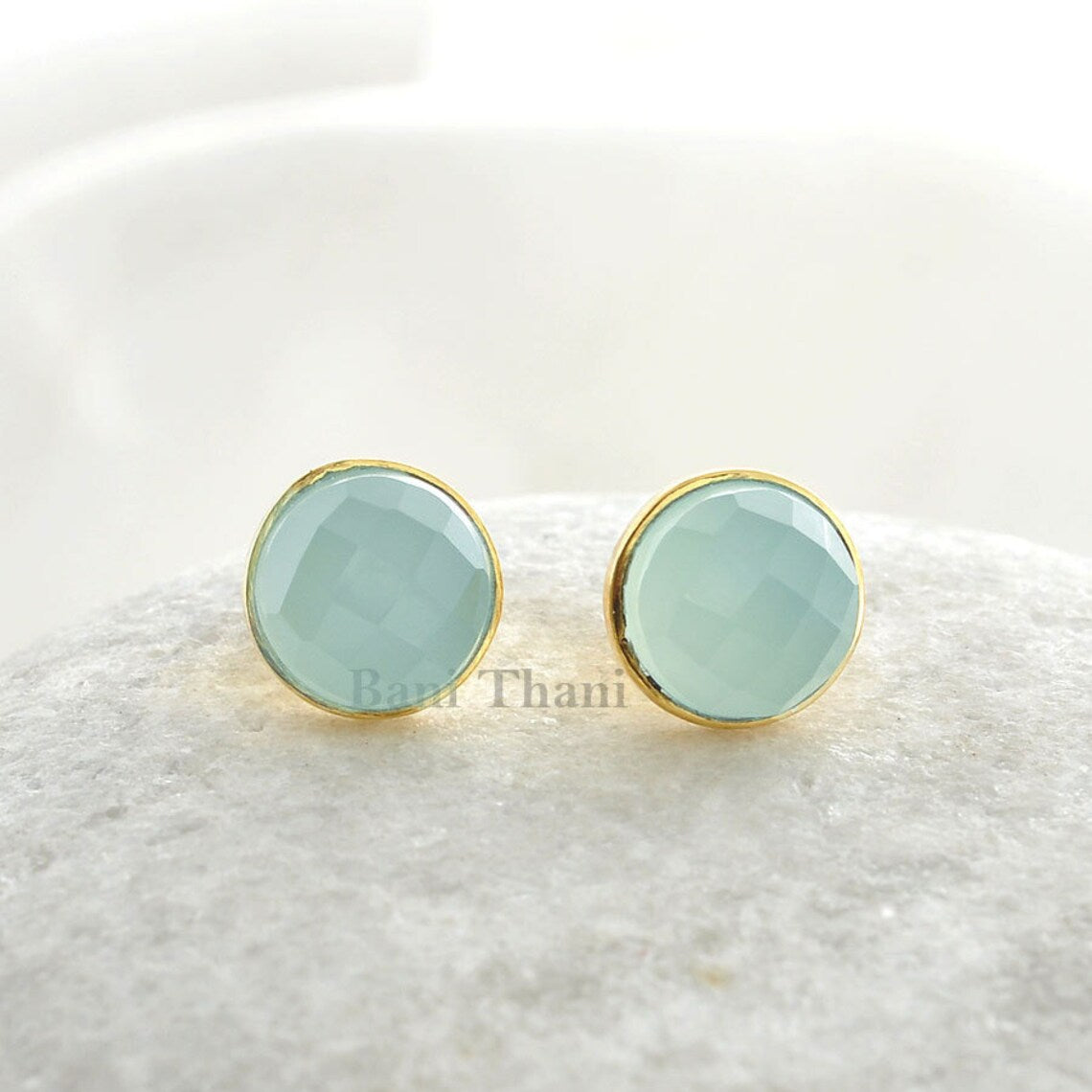 Aqua Chalcedony Earrings, Aqua Chalcedony 9mm Round Faceted 18k Gold Plated 925 Sterling Silver Stud Earrings, Engagement Gift For Her