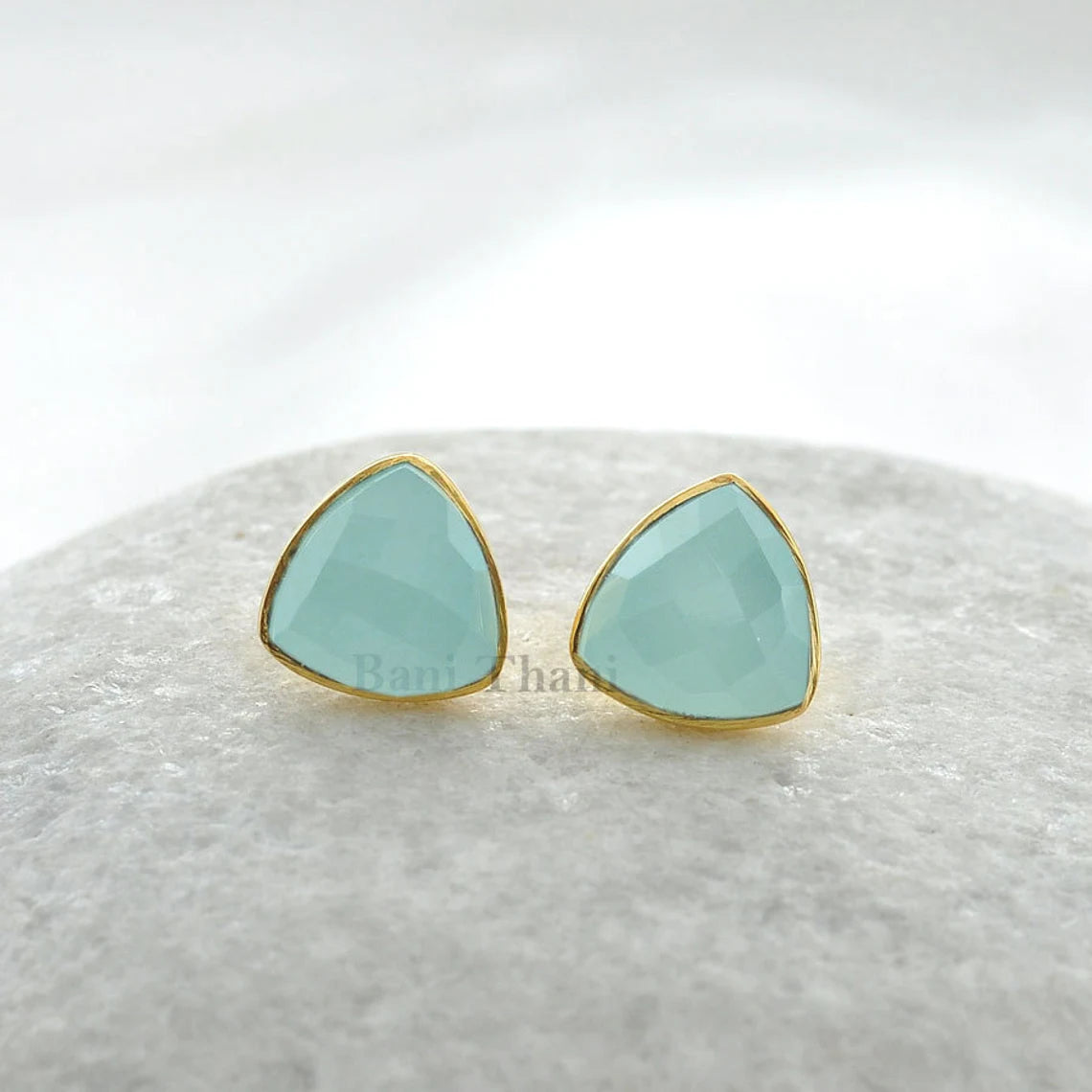 Aqua Chalcedony Studs - Gold Plated Studs - Solid Silver - 9mm Faceted Trillion - Personalized Jewelry - Jewelry For Summer - Gift For Wife