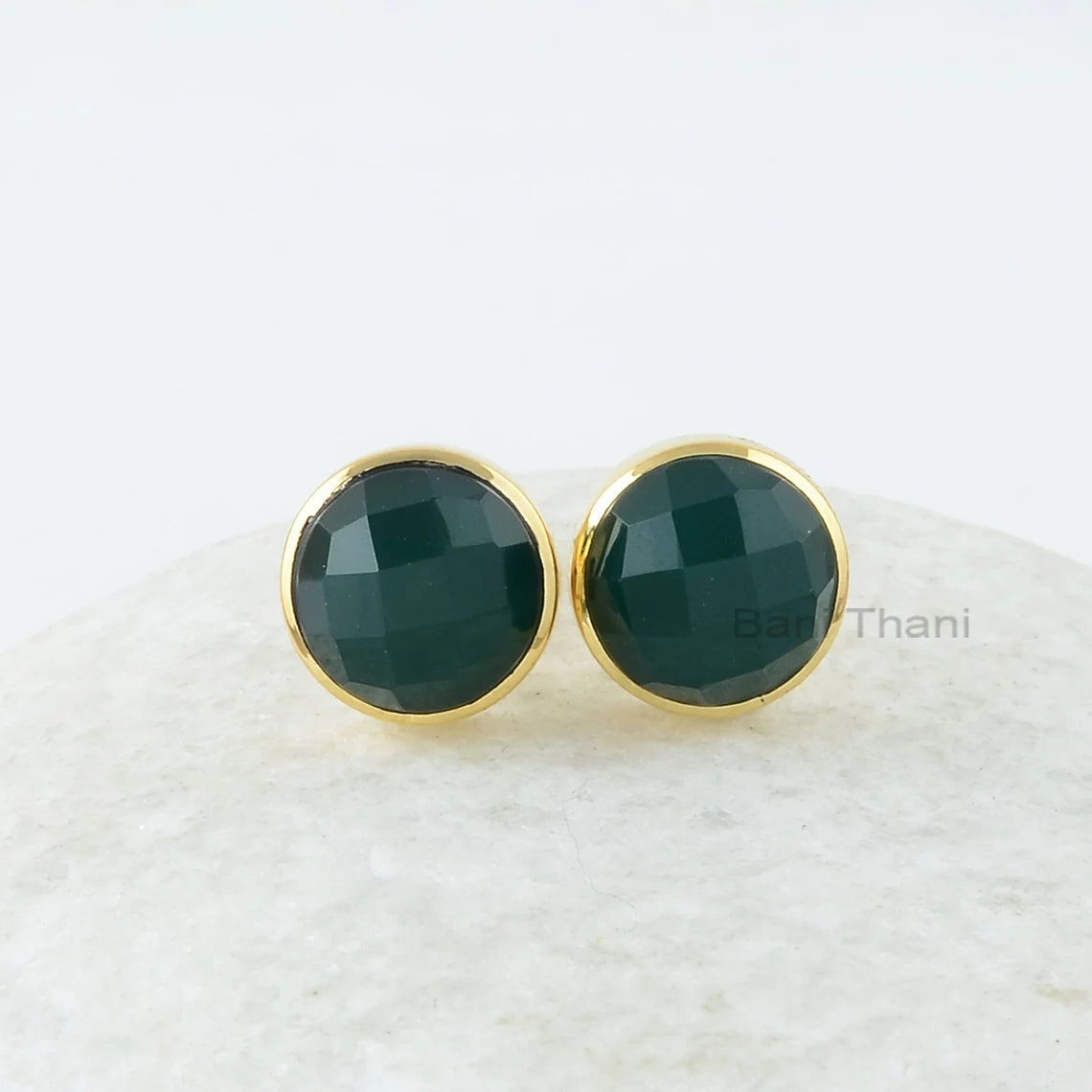 Onyx Stud Earrings, Green Onyx 10 mm Round Shape Gemstone Earrings, 18k Gold Plated, 925 Sterling Silver, Bezel Set Stud Earrings For Women
