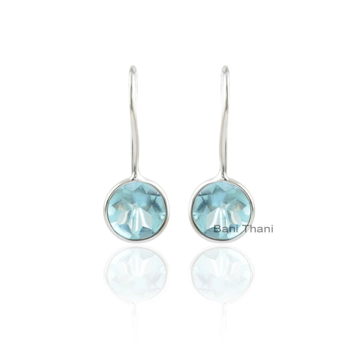 Aqua Quartz Earring, Aqua Quartz 10x10mm Buff Top Round Gemstone Earring, 925 Sterling Silver Dangle Earring