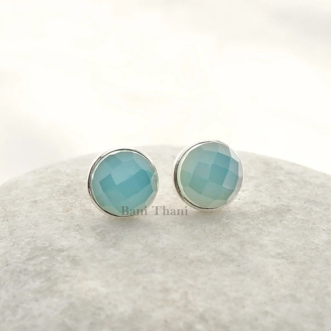 Blue Chalcedony Gemstone Stud Earrings - 925 Sterling Silver Stud Earrings - Christmas Gift Earrings - Personalized Gift For Mom - 9mm Round