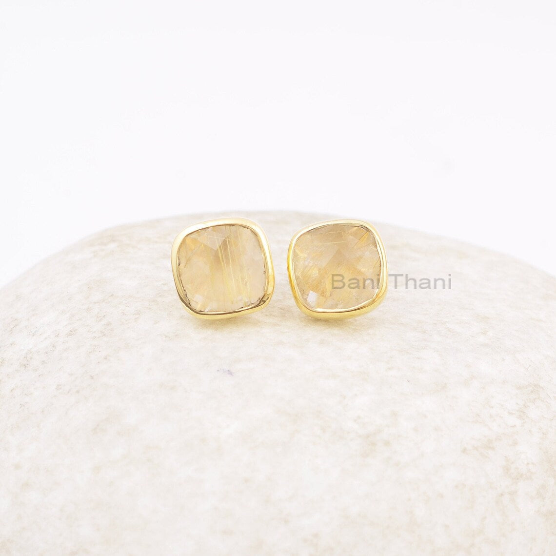 Golden Rutilated Quartz Earrings - 925 Silver - 9mm Faceted Cushion - Rose Gold Plated - Trendy Jewelry - Gift For Summer - Jewelry For Lady