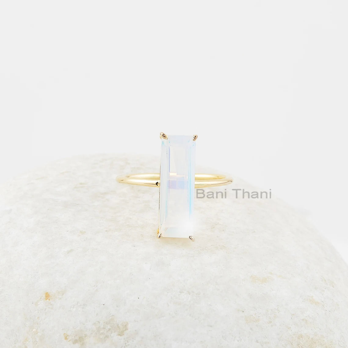 Opalite Quartz 6x18mm Rectangle Shape Ring, Gold Micron Stylish Prong Set Silver Ring, Blue Fire Gemstone Ring