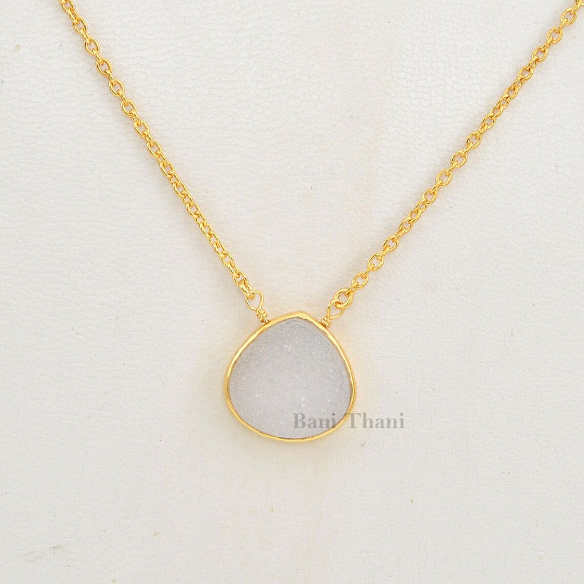 White Druzy Heart Gemstone Necklace Gold Plated Necklace 925 Sterling Silver Necklace, Bridal Necklace 15mm
