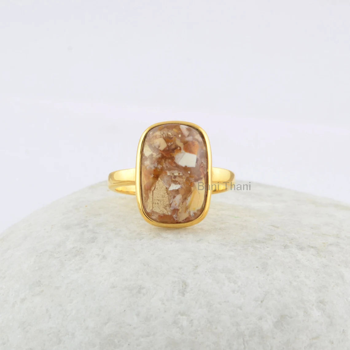 925 Sterling Silver Ring-Brecciated Mookaite Square 10x15mm Gemstone Ring-Micron Gold Plated Ring-Beautiful Wedding Ring-Christmas Gift Ring