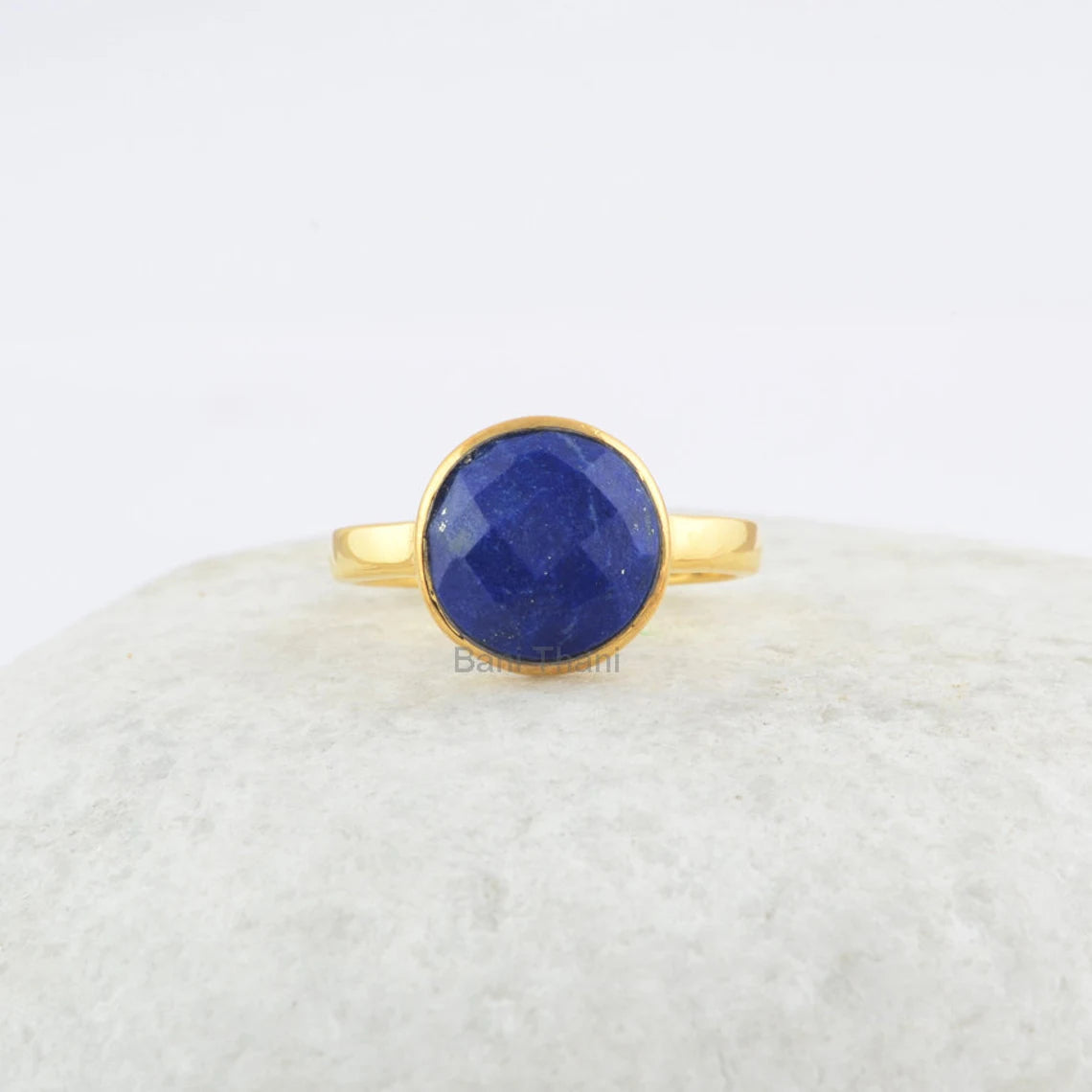 925 Sterling Silver Ring - Lapis Lazuli Ring - 10mm Round Gemstone Ring - Gold Plated Ring - Bezel Ring - Gift for Women - Handmade Jewelry