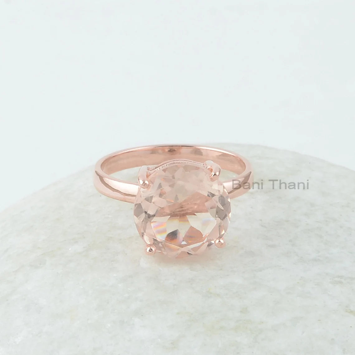 Morganite Silver Ring, Morganite Quartz Faceted Cut 12mm Round Gemstone Ring, Rose Gold Plated Ring, Gemstone Silver Rings For Women