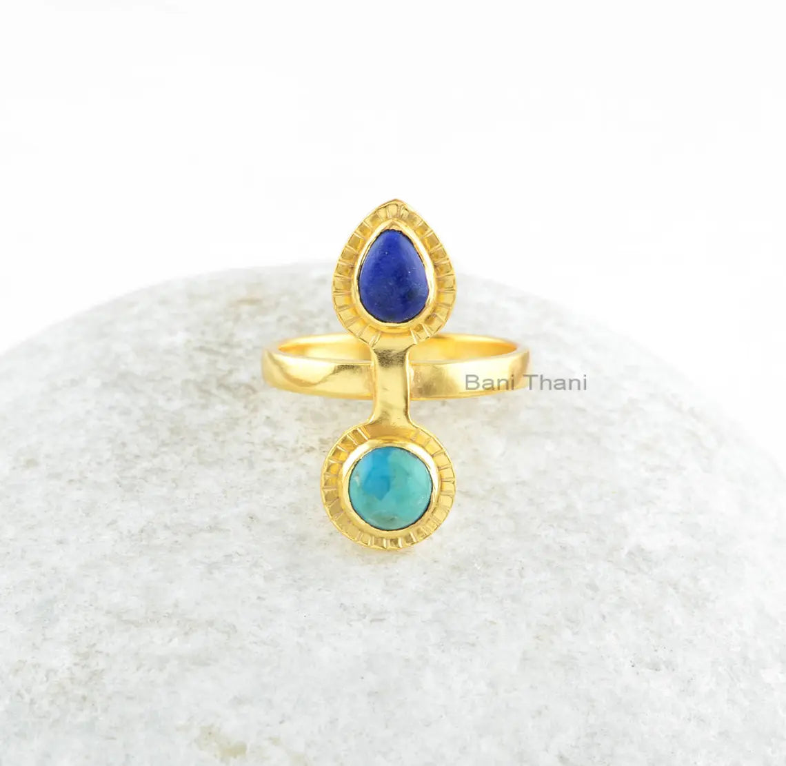 Lapis Lazuli, Arizona Turquoise Gemstone Ring - Gold Plated Anniversary Gift Ring - 925 Sterling Silver Gemstone Ring - Multi Stone Ring