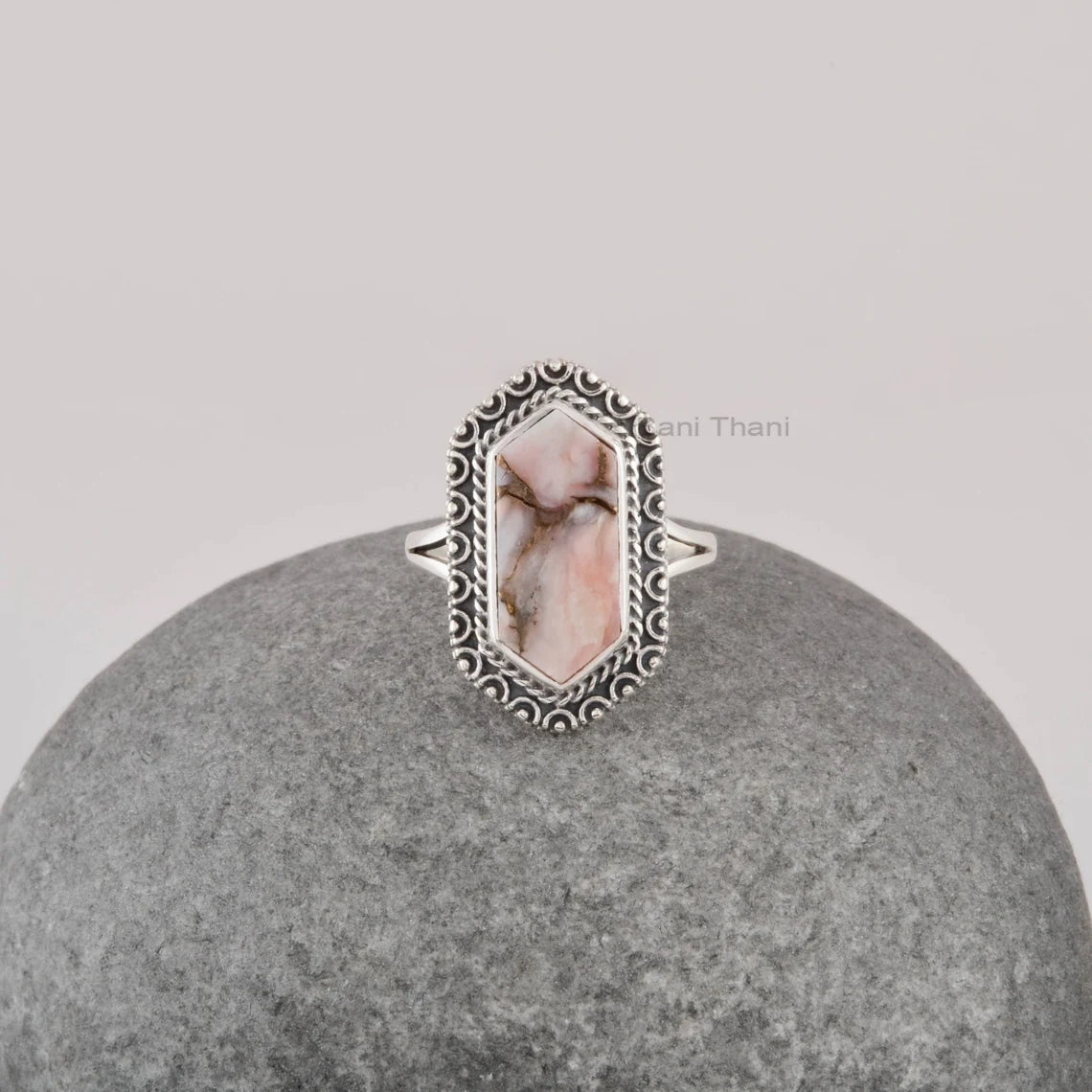 Handcrafted Boho Ring - Pink Opal Copper Gemstone Ring - Gift for Bridesmaid - Jewelry for Women - Pure 925 Silver Dotted Ring- Hexagon Ring