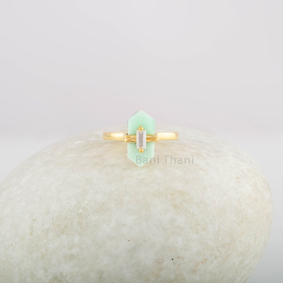 Chrysoprase Ring - 7x15mm Hexagon and 2.5x5mm Baguette STY Diamond Sterling Silver Ring - Gold Plated Handcrafted Ring - Gift For Mother