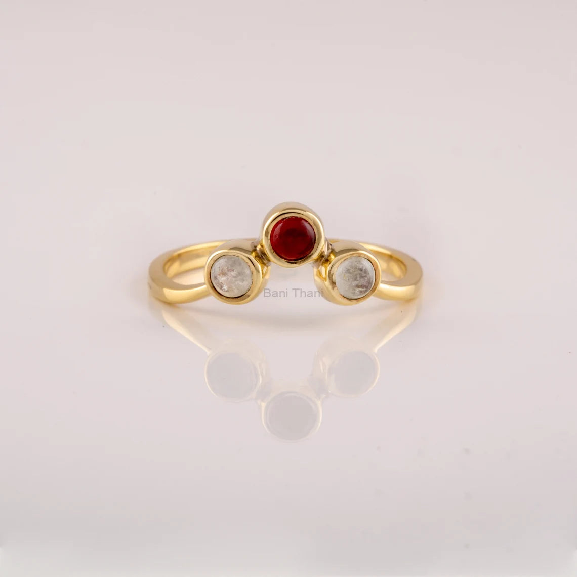V Shape Ring, 3 mm Round Shape Three Gemstone Gold Plated Solid Silver Ring, Red Garnet & Moonstone Statement Ring For Women, Gift For Her