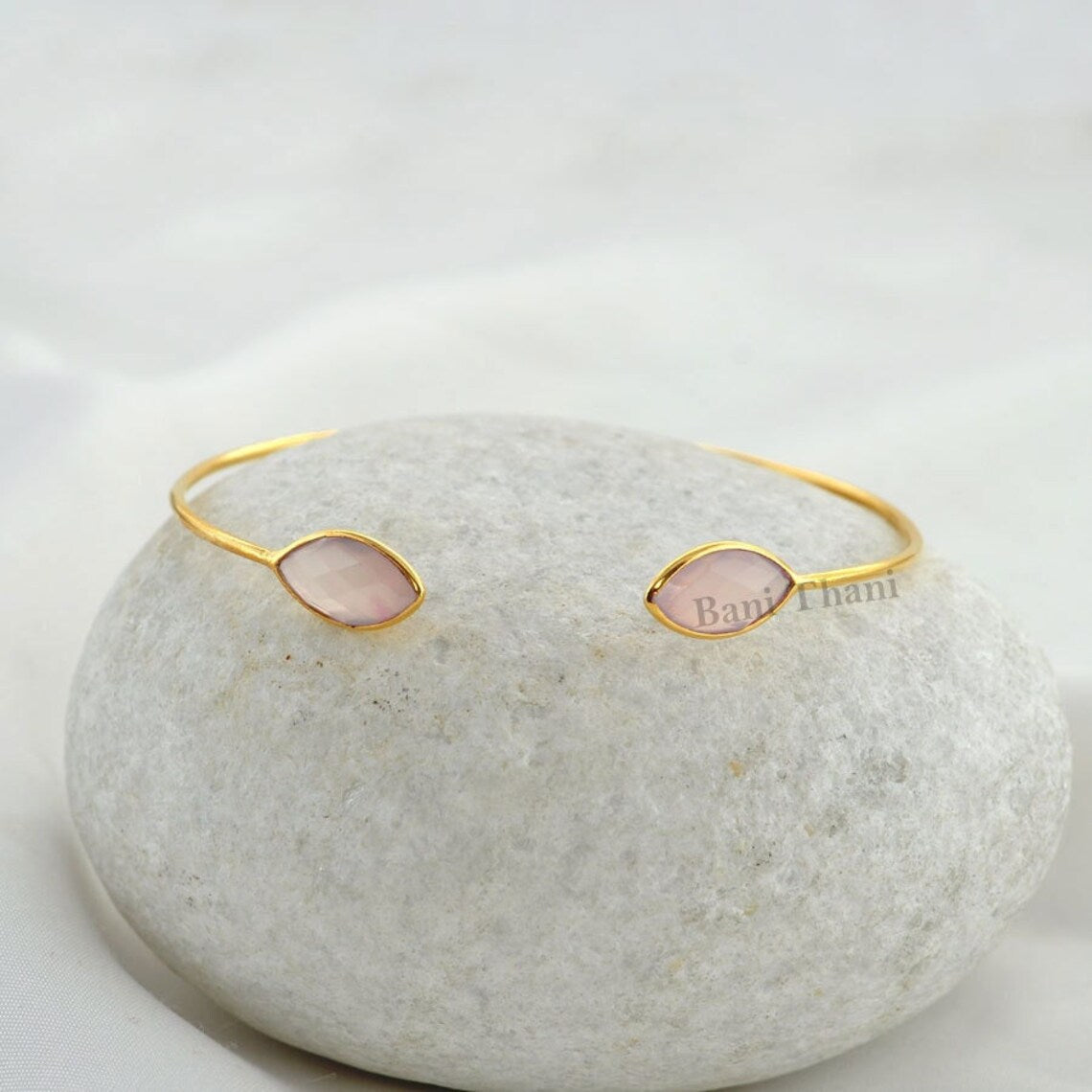 Pink Chalcedony Gemstone Bracelets - Gold Plated Bangle - Gift Jewelry - Sterling Silver Bangle Bracelet, 7x14mm