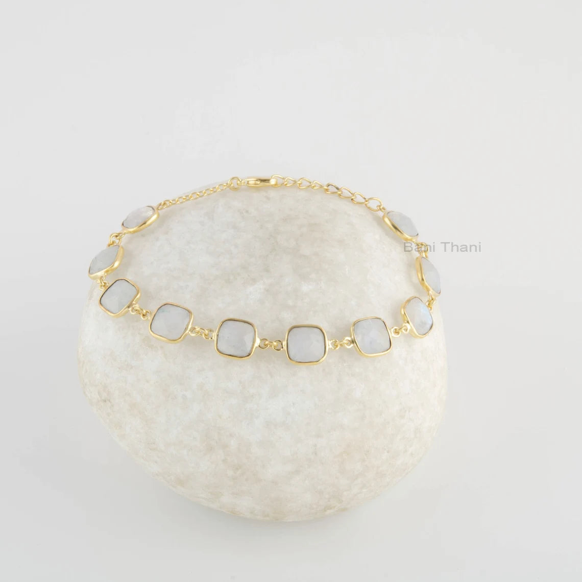 Rainbow Moonstone Cushion Gemstone Bracelet - 925 Sterling Silver Handmade Bracelet - Gold Plated Chain Bracelet - Gift for Mom - Gift Her