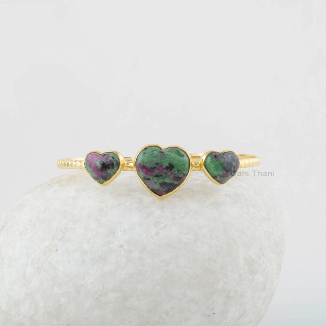 Ruby Zoisite Gemstone Bracelet - Gold Plated Bracelet - Heart Cuff Bangle - 925 Solid Silver - Gift for Birthday - Adjustable Cuff Bracelet