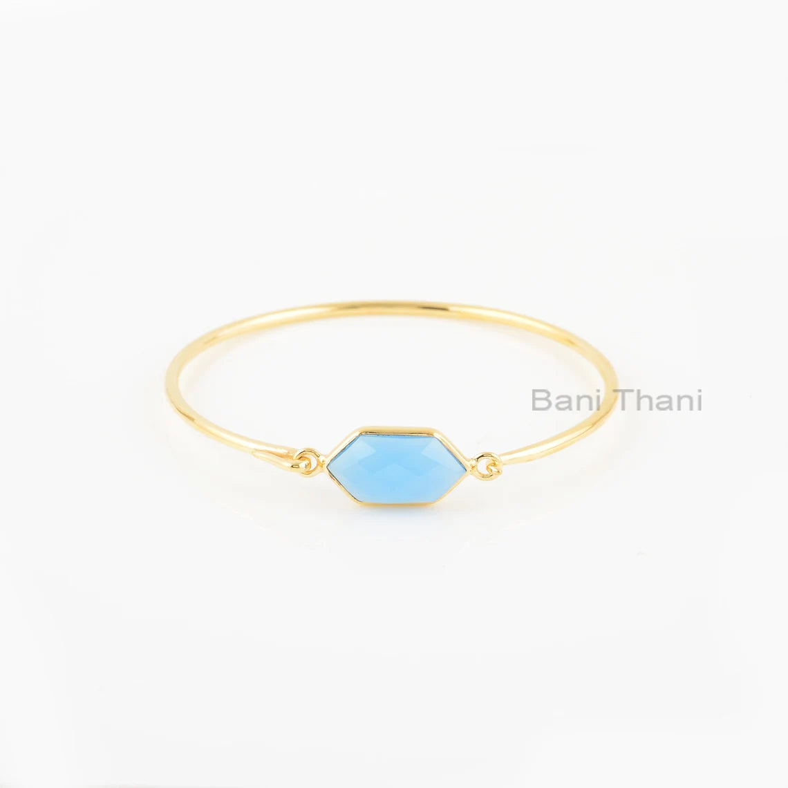 Elegant Bracelet, Blue Chalcedony 9x18mm Hexagon Gemstone Silver Bangle, Chalcedony Gold Plated Bezel Set Bracelet, Gift For Girlfriend