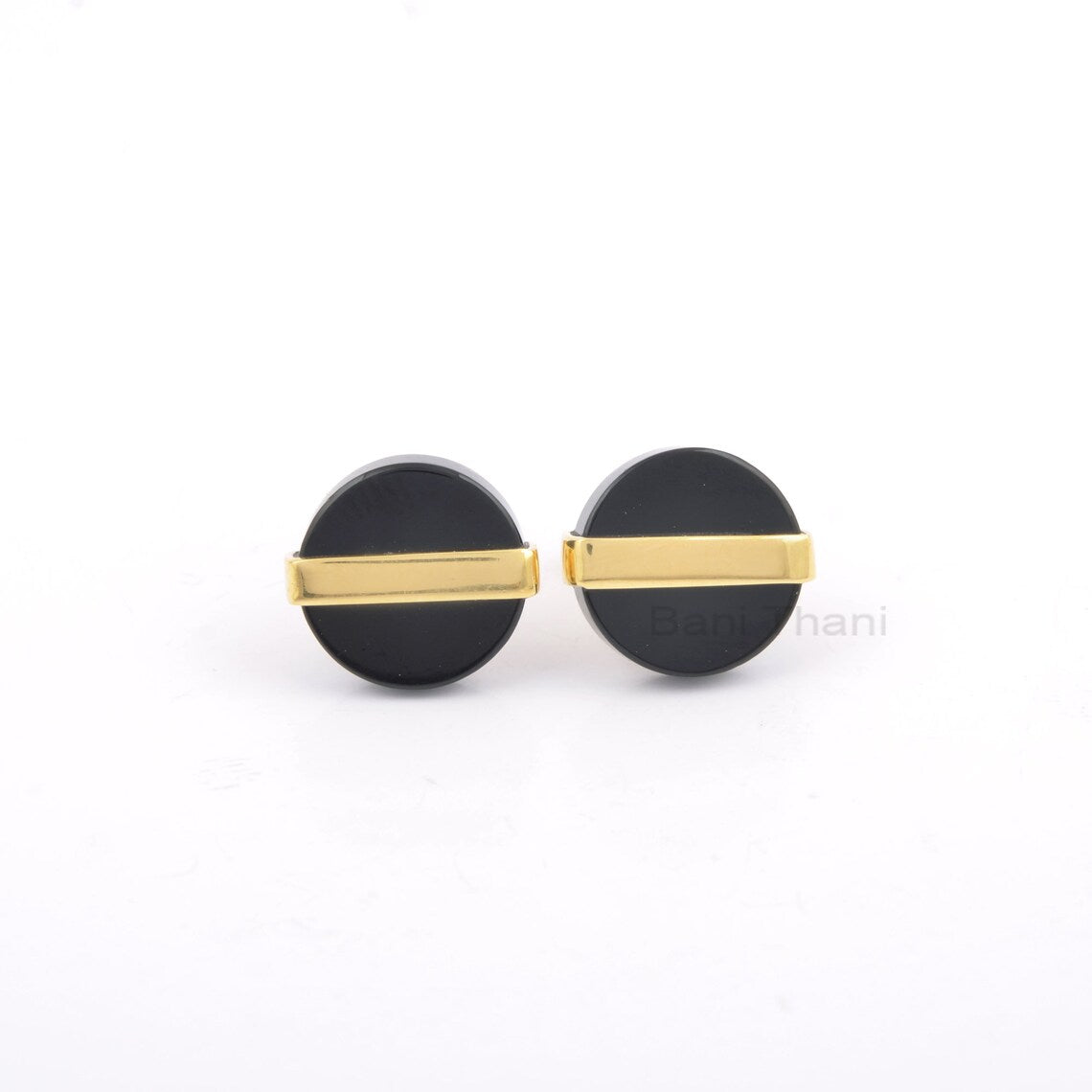 Elegant Black Onyx Flat Round Gemstone Stud Earrings, 18k Gold Plated Silver Stud Earrings, Fashion Jewelry, Dainty Earring, Bridal Jewelry