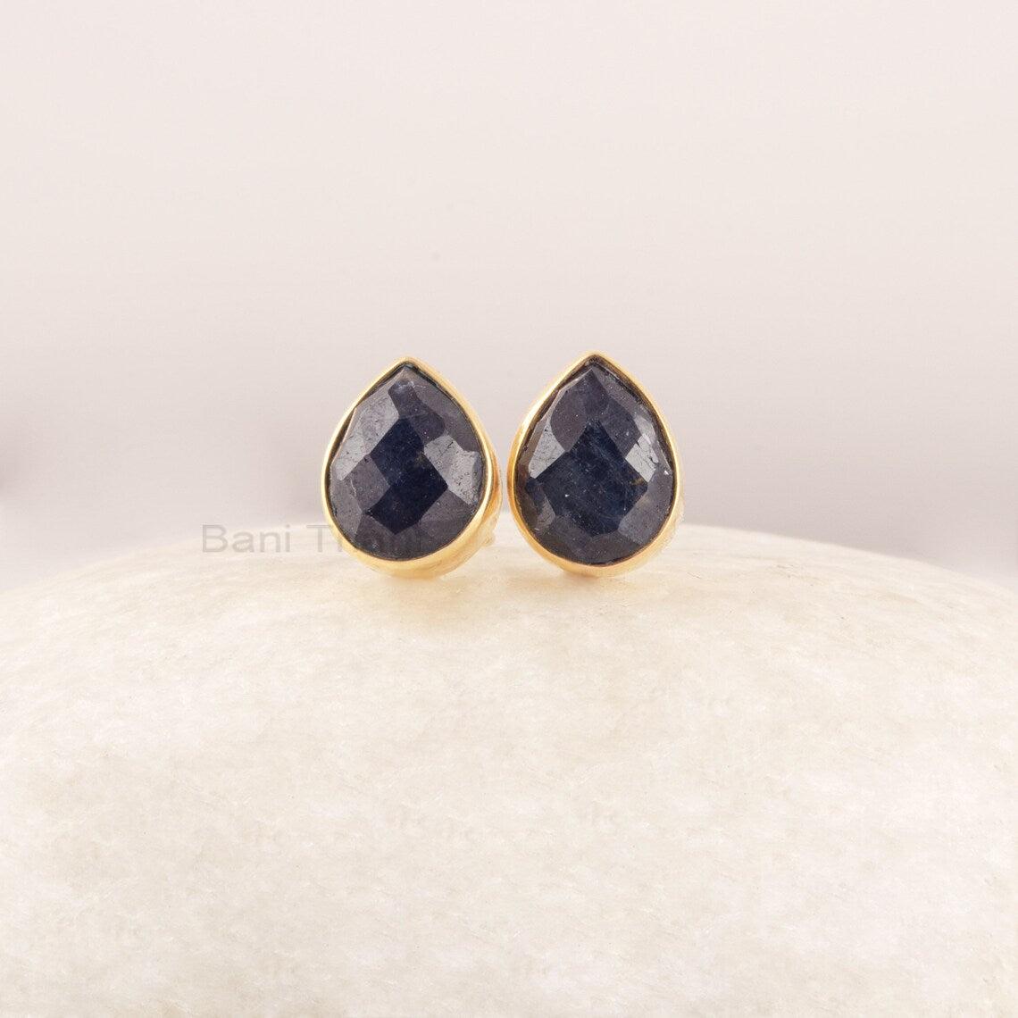 Natural Sapphire Stud Earrings - Sterling Silver - Gold Plated - Pear Shape Blue Gemstone - Birthstone Earrings - Sapphire Stud for Women