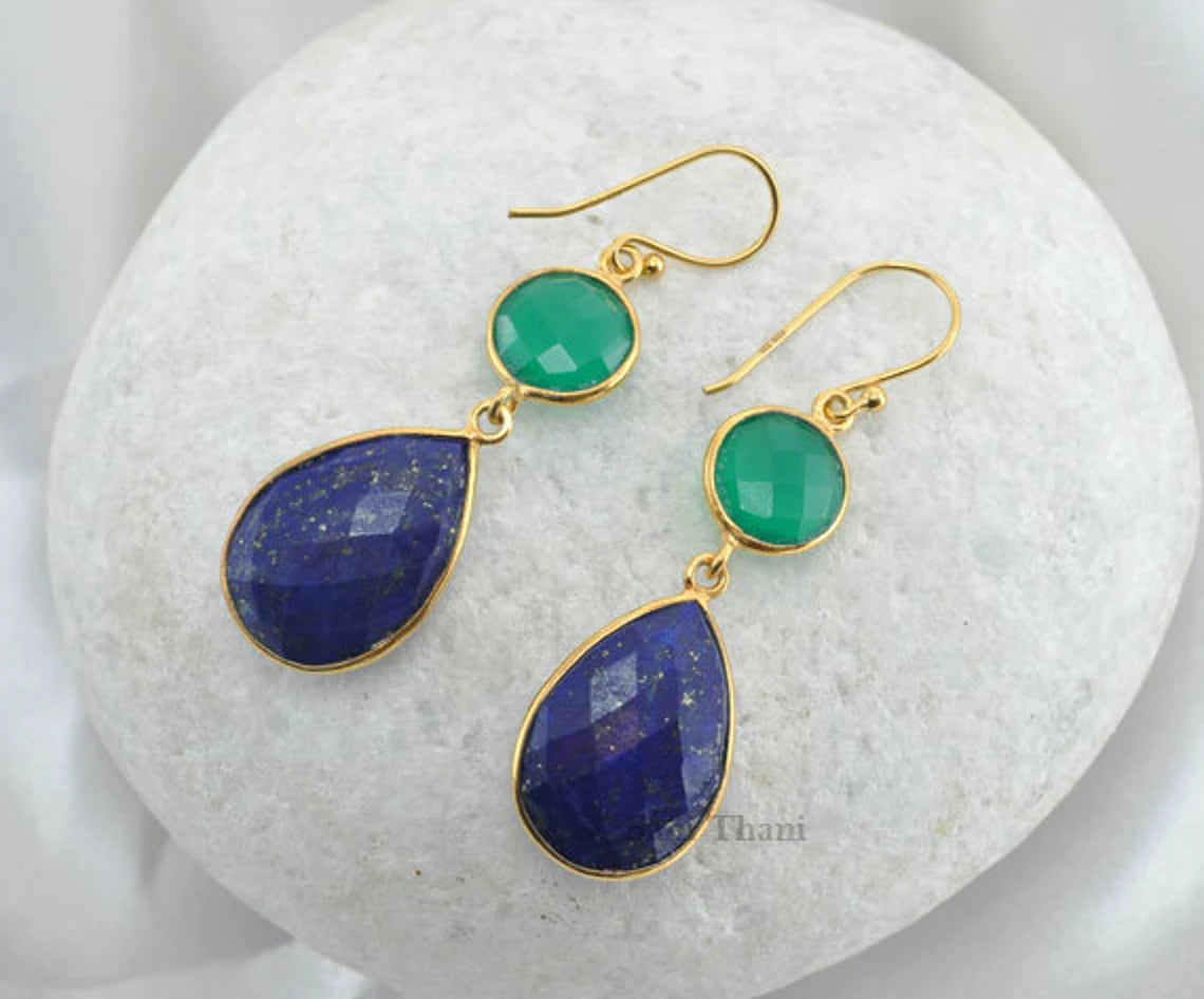 Lapis and Green Onyx Gemstone Dangle Earrings, Micron Gold Plated 925 Sterling Silver Earrings