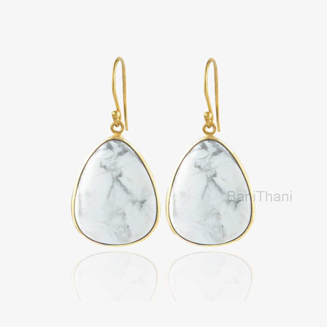 Howlite Earrings, White Howlite 16x24mm Pear Gemstone Sterling Silver Earrings, Dangle Drop Earrings, Gold Plated Earrings, Gift For Mother