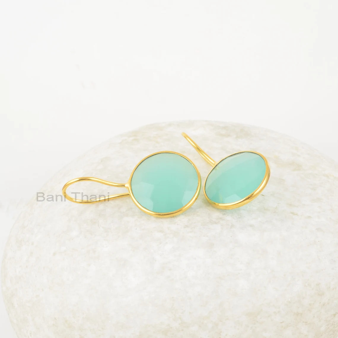 Handmade Bezel Aqua Chalcedony Gemstone Earring, Round 15mm Gemstone Silver Drop Earrings, 18k Gold Plated Earrings For Women's Gift Earring