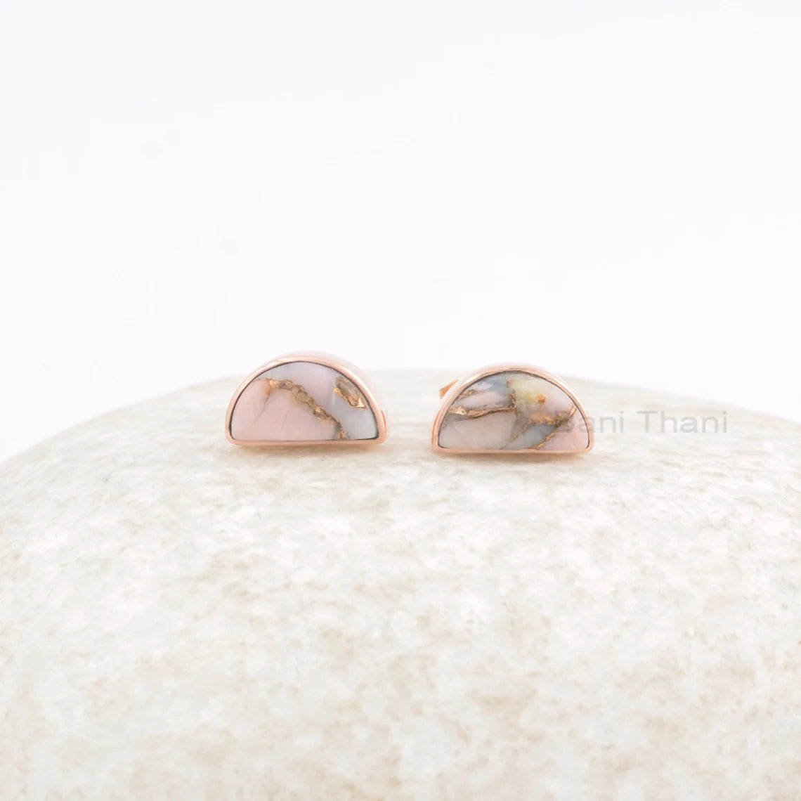 Pink Opal Copper 5x10mm Halfmoon Gemstone Stud Earrings, 925 Silver Bezel Earring, Rose Gold Plated Stud Earring, Bridal Gift Jewelry