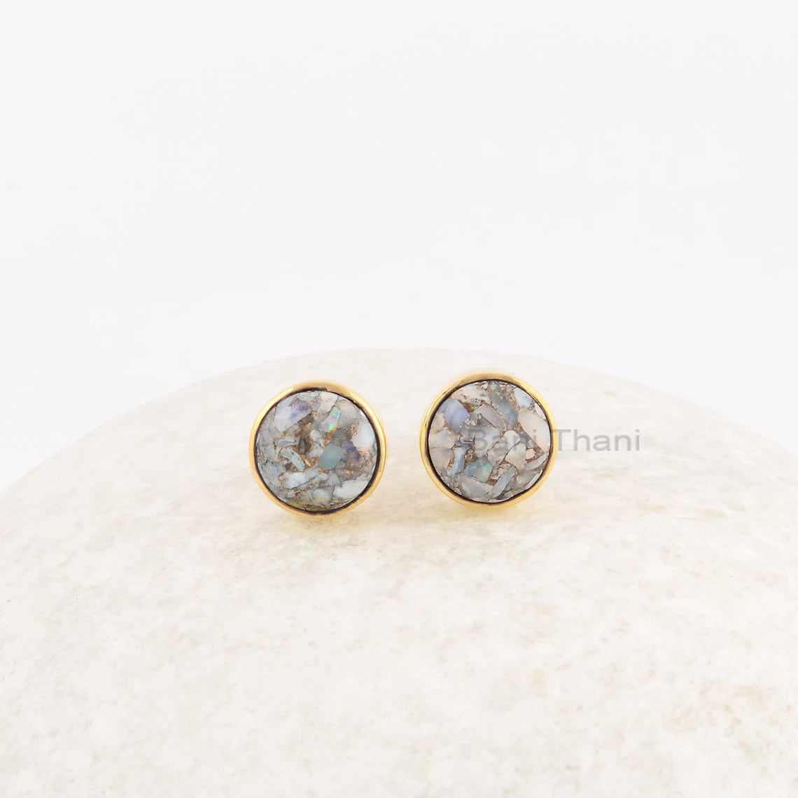Elegant Ethiopian Opal Copper Round 9mm Gemstone Stud Earrings, 925 Silver Gold Plated Earrings, Wedding Gift Earrings, Simple Bezel Earring