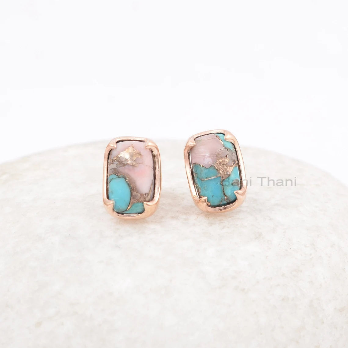 Pink Opal Earring - Gemstone Stud Earrings - Copper Turquoise Earring - 925 Solid Silver - Rose Gold - Womens Gift Earring - 7x11mm Cushion