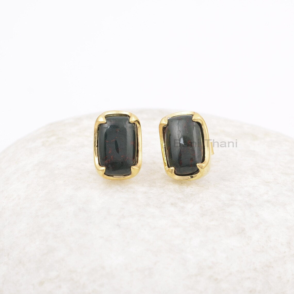 Natural Bloodstone Stud 7x11mm Cushion Gemstone Earrings, Prong Set Handmade Earrings, 925 Silver 18k Gold Plated Earring, Womens Day Gift