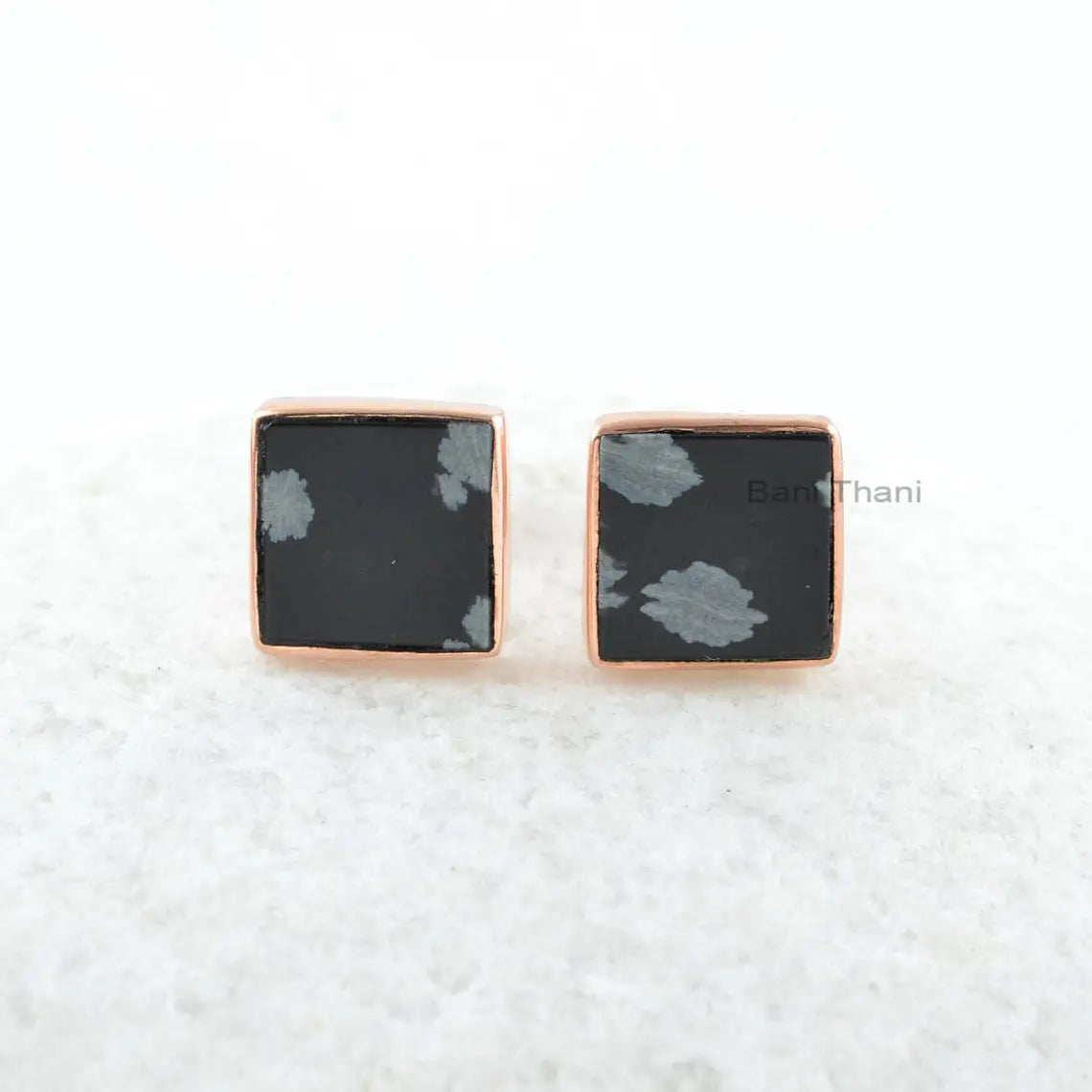 Snowflake Obsidian Stud Earrings - Sterling Silver - Rose Gold Studs - 9x9mm Flat Square - Gift For New Beginning - Jewelry For Inspiration