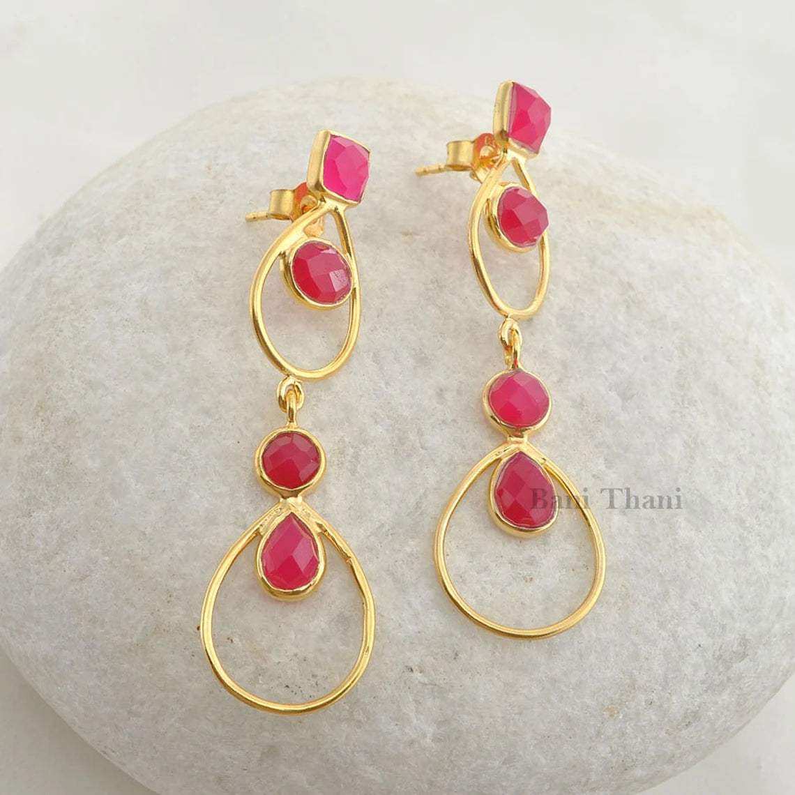 Handmade Designer Hot Pink Chalcedony 5mm x 7mm Faceted Micron Gold Plated 925 Sterling Silver Earring