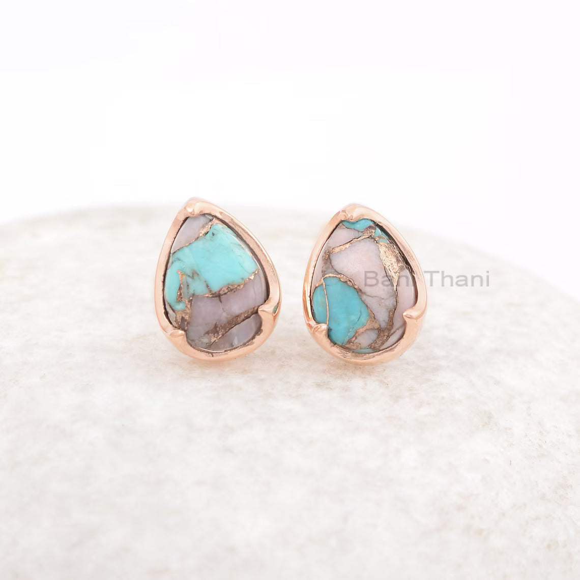 Cute Pink Opal Copper Turquoise Pear Gemstone Earrings, 925 Sterling Silver Rose Gold Plated Earring, Anniversary Gift Earring, Gift For Her