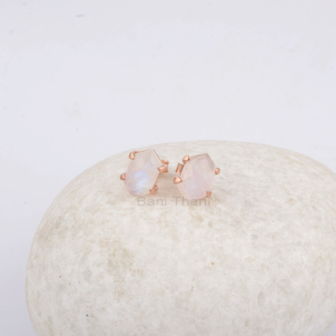 Rainbow Moonstone Studs Earrings - Handcrafted Studs - 7x12mm Hexagon - Dainty Jewelry - Jewelry For The Bridesmaids - Gift For Young Sister
