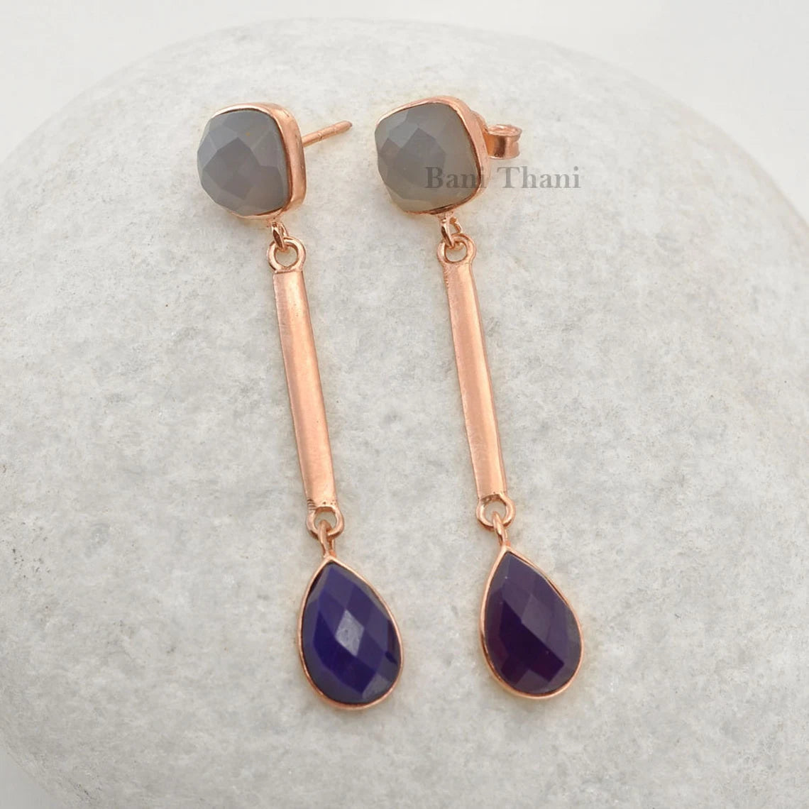 Grey Chalcedony and Amethyst Chalcedony Gemstone Drop Earrings, Rose Gold Plated 925 Sterling Silver Dangle Earrings, Womens Gift Earrings