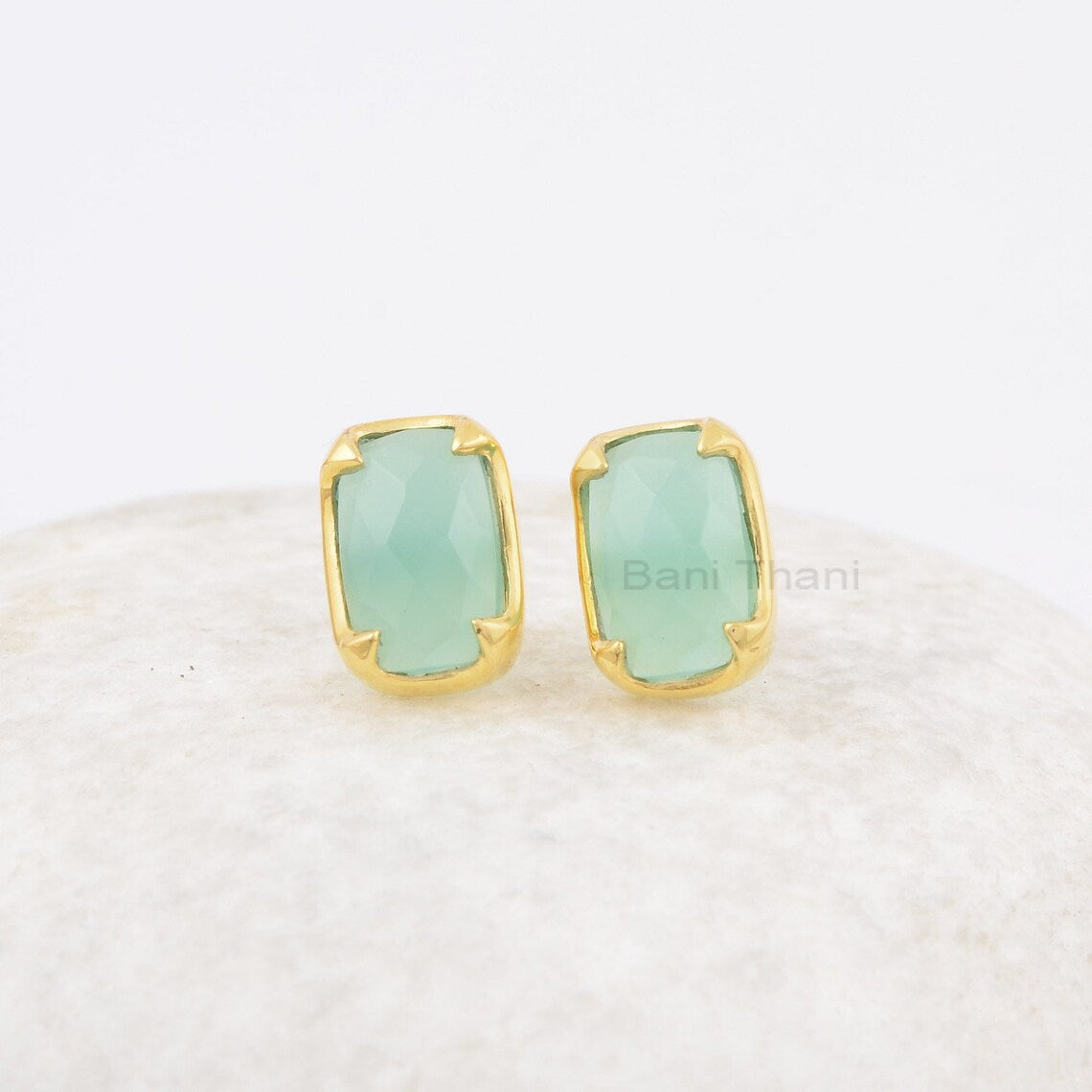 Chalcedony Stud Earrings, Aqua Chalcedony 7x11mm Cushion Gemstone Earring, Prong Set Earring, 925 Silver Gold Plated Earring, Dainty Earring