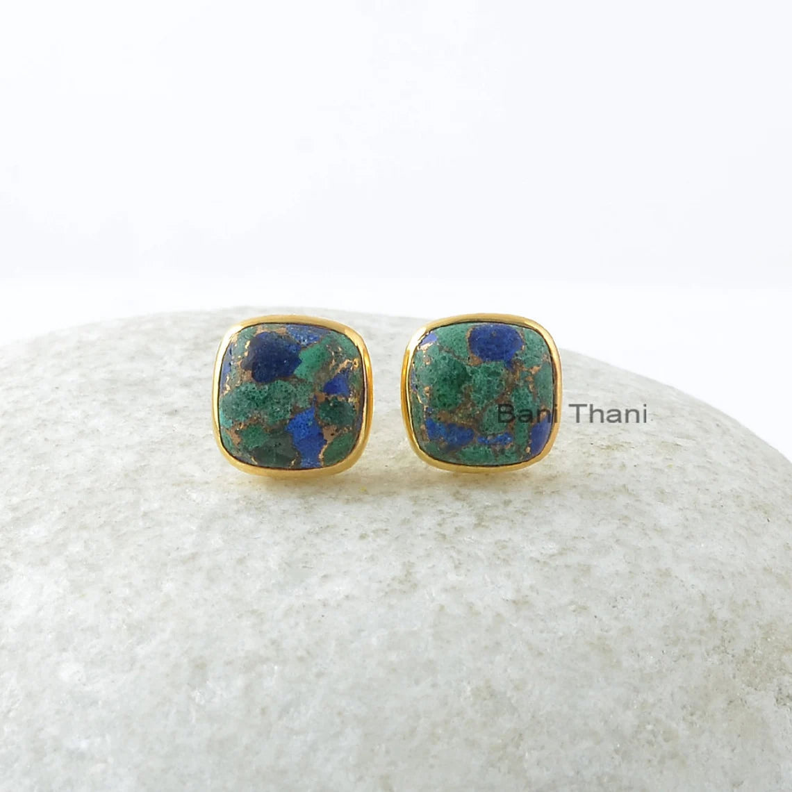 Azurite Stud Earrings - Solid Silver Earrings - Gold Plated Studs - Statement Jewelry - Gift For Lady - Jewelry for Prom - 9mm Cushion Stud