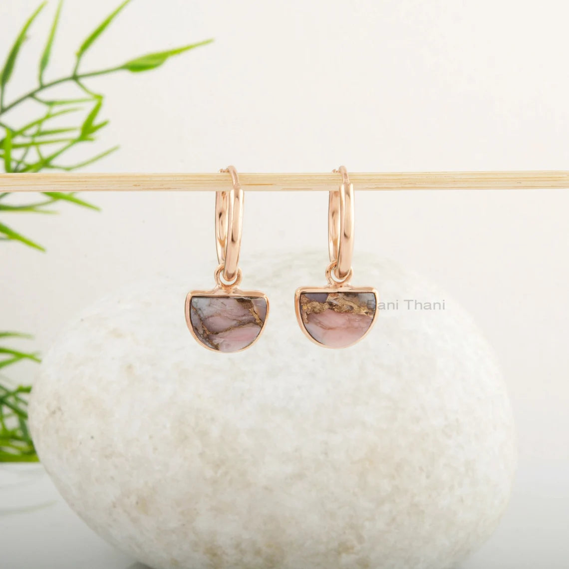 Silver Hoop Earrings - Pink Opal Gemstone Earrings - 7x10mm Half Moon Shape Earrings - Rose Gold Earring - Gift for Women - Handmade Jewelry