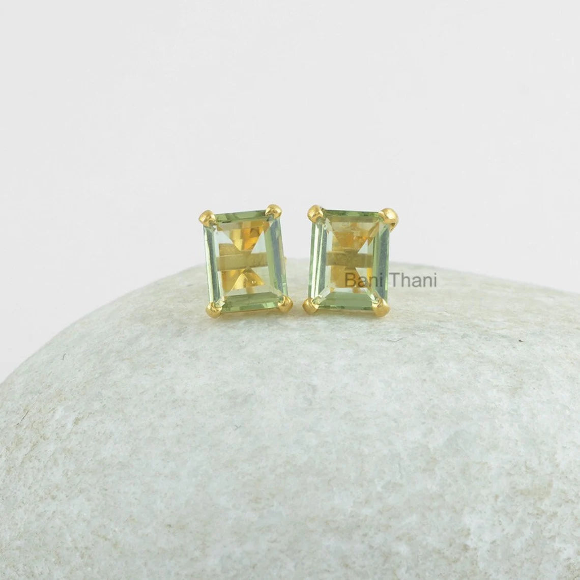 Green Amethyst Quartz Stud Earrings - Gemstone Studs - Sterling Silver - 8x10mm Octagon Faceted - Jewelry For Beach - Gift For Old Women