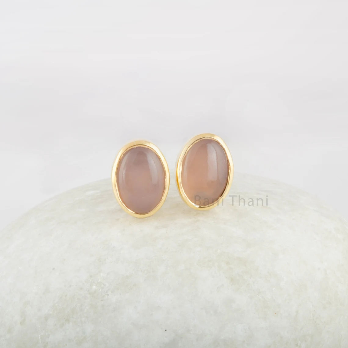 Pink Chalcedony Stud 925 Pure Silver Gold Plated Handmade Earrings - 10x12 mm Oval - Casual Studs - Gift For Women - Handcrafted Masterpiece