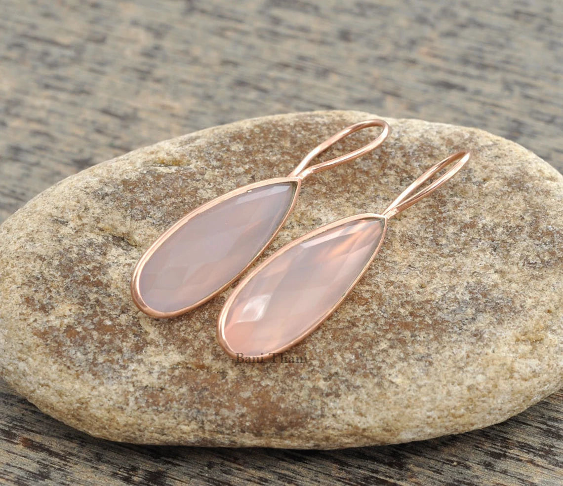 Gemstone Earrings, Silver Earrings, Pink Chalcedony Faceted Pear Shape Micron Rose Gold Plated Sterling Silver Dangle Earrings