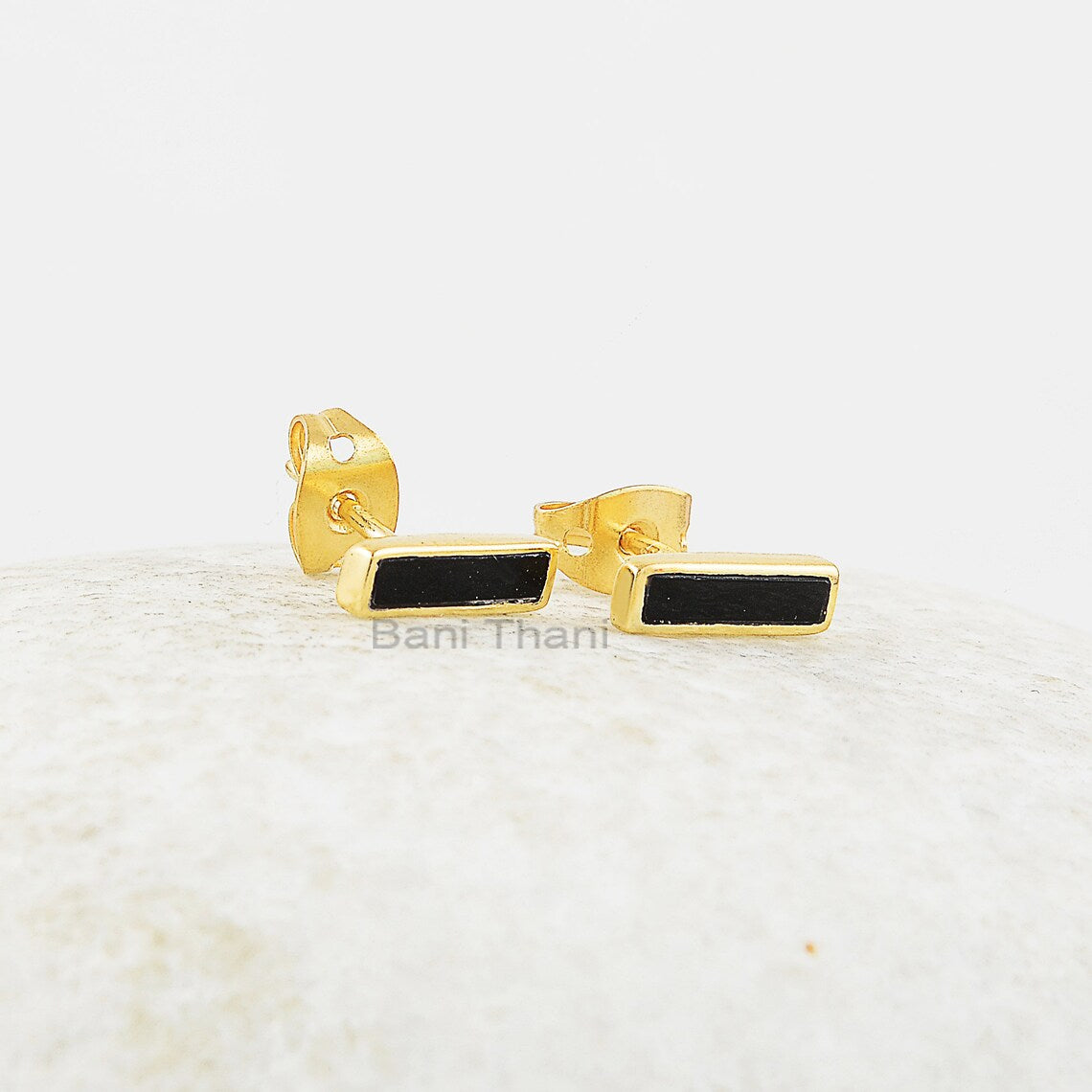 Elegant Black Onyx 2x8mm Rectangle Gemstone Studs Earrings, Gold Micron Sterling Silver Bezel Set Studs Earring Jewelry, Best Gift For Women