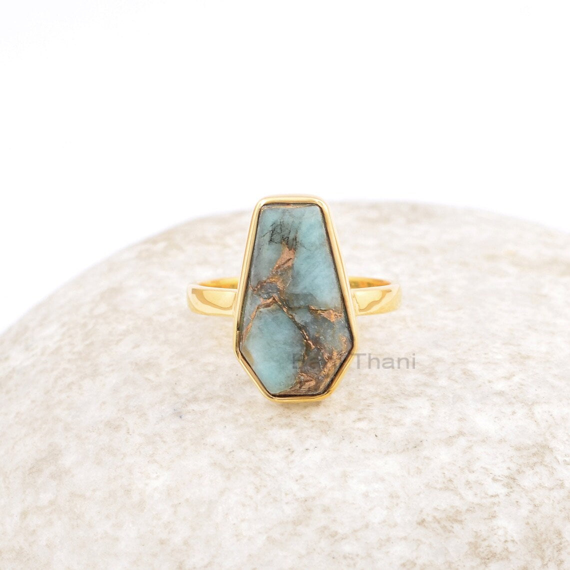 Coffin Ring, Copper Amazonite 10x17 mm Coffin Shape Gemstone 925 Silver Ring, Bezel Ring, 18k Gold Plated Handmade Ring, Women's Gift Ring