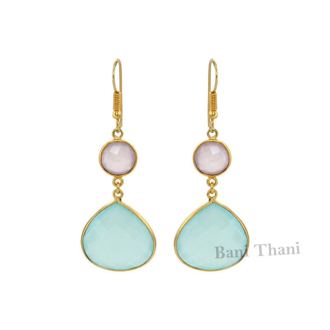 Silver Earring, Gemstone Earring, Pink Chalcedony 10mm and Aqua Chalcedony 15mm Gold Plated Sterling Silver EarringĀ