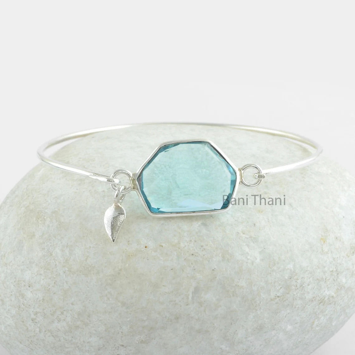 Aqua Quartz Nugget Special Cut Gemstone Bezel Bangle, Leaf Charm Bangle, 925 Sterling Silver Bangle, Christmas Gift Bangle, Bangle Bracelet