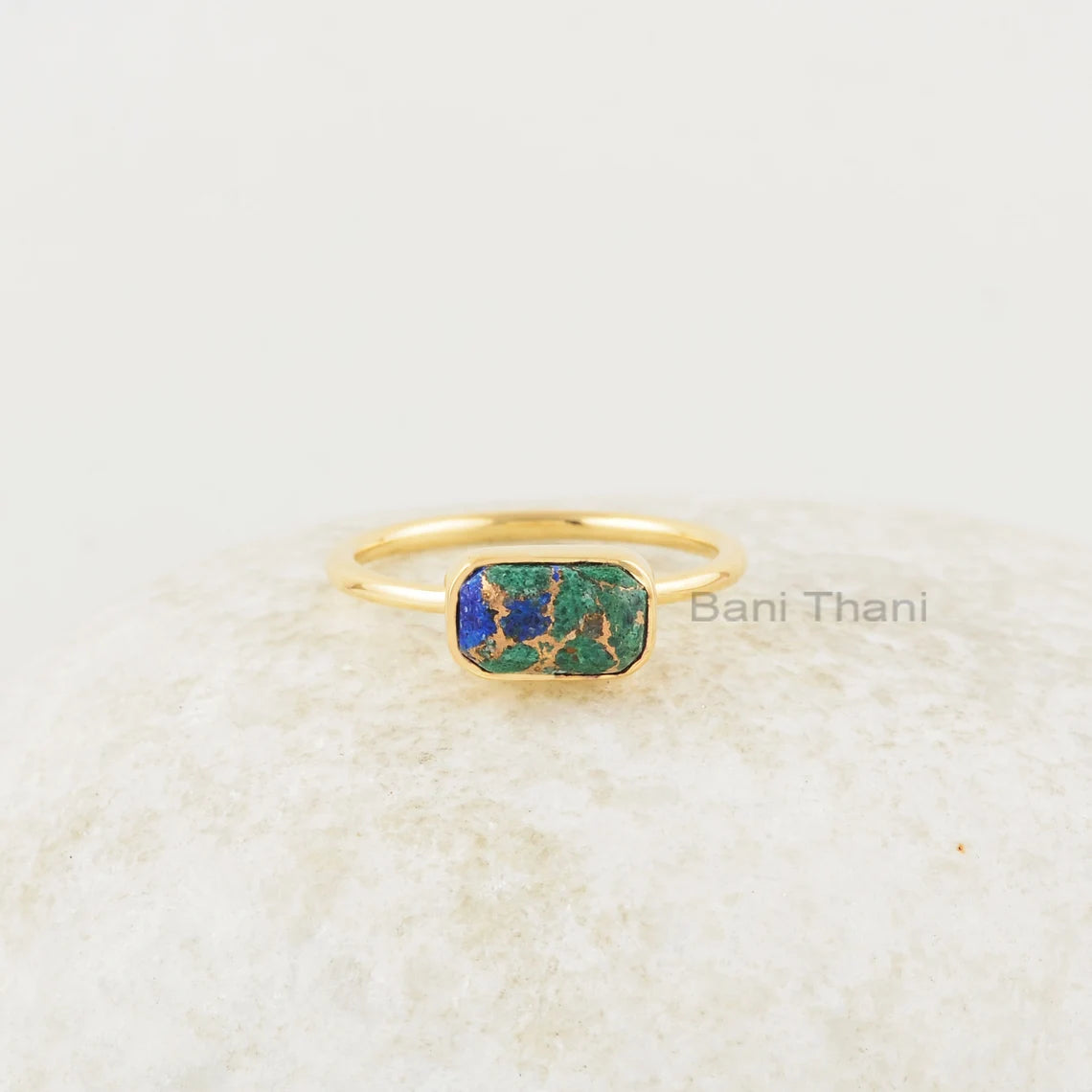 Azurite Ring, Azurite Copper 5x9mm Rectangle Shape Gold Plated Gemstone Ring, Bezel Set Silver Gemstone Ring, Beautiful Ring Gift For Her